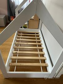 Letto & casa in legno stile scandinavo nordico bambino cameretta 160x80cm (colore: bianco), con Tetto e Rete a Doghe in Legno di Pino Massiccio Robusto e Facile da Montare Peso Max. 100 kg.