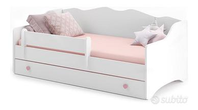 La struttura comprende un cassetto su ruote con cuori grigio che può essere utilizzato come contenitore, Ringhiera rimovibile e mobile - 80 cm, doghe in legno e in regalo materasso.