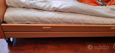 Letto elettrico a 1 piazza Medley Ergo Select con 2 snodi in legno chiaro, sponde sollevabili con accessorio asta di sollevamento e maniglia ruote bloccabili. Il materasso non é anticubito. Disponibile il Manuale d'uso ed usato solo pochi anni.