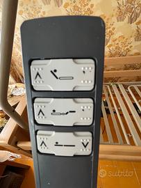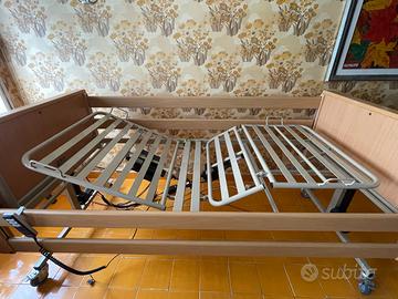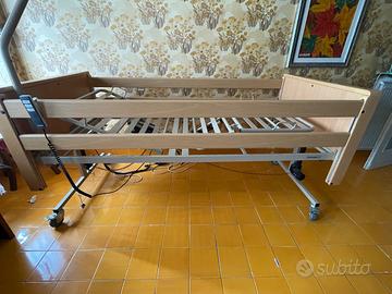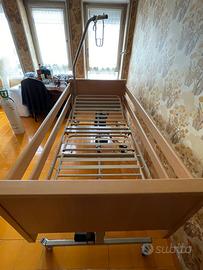Letto singolo per degenza. Sponde laterali mobili, altezza del letto, schienale e altezza gambe regolabili. Dotato di ruote, con freno. Braccio per flebo incluso.
