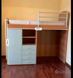 Letto ponte singolo color ciliegio e verde salvia. È possibile posizionare un secondo letto nello spazio dedicato. L'armadio ponte è dotato di cassettiera e vano contenitore. Ottime condizioni. Dimensioni 142cm x 197cm. Profondità 90cm