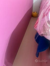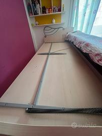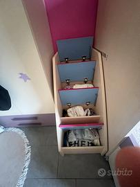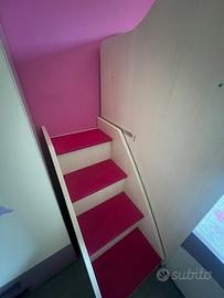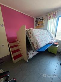 Letto a Ponte scorrevole... No Ikea, No mondo convenienza.. struttura molto forte e resistente. Si tratta di un letto ponte scorrevole, con una scala fatta di contenitori molto comodi per mettere dei giochi o di tutto.. per non lasciare disordine.. letto sopra è scorrevole. Viene in avanti. Basta spingere e puoi recuperare 50cm nella camera.. in oltre il letto ha una funzionalità ( che raramente la trovi) si inclina. Molto comodo per sistemarlo senza necessità di salire dalla pedana dietro.. ha una sponda di sicurezza.. le pedane dei scalini si possono verniciare ( in caso dei figli maschi).. ha una mensola sotto per appoggiare delle cose…IL LETTO SOTTO NON E COMPRESO.. lo spazio sotto si può utilizzare come scrivania o mettere un altro letto ( come nella foto).. trasporto a carico di chi acquisisce.. vi posso dare una mano nel caricare. Grazie ( NON SPEDISCO).. REGALO un tappeto color fucsia, un comodino e una scrivania molto bella. Per motivi di spazio non riesco mettere le foto