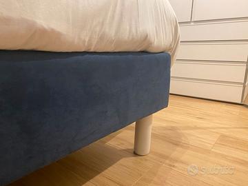 Vendo letto rete Dorelan matrimoniale 140x190 cm, senza testiera, rivestito in scamosciato blu elegante e facile da abbinare.