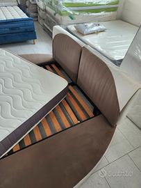 letto matrimoniale, con struttura rotonda, rivestita in velluto antimacchia doppio colore tortora e bianco perla, tessuto idrorepellente di alta qualità, completo di reti a doghe di faggio predisposto per materasso 160x190 a molle insachettate ortopedico. letto infine produzione disponibile solamente questo come in foto, usufruito per fare le foto al catalogo generale, disponibile da visionare presso la produzione previo appuntamento
