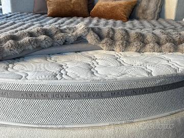 Letto Rotondo diametro 223 × 223, testata centimetri 25 dotato di kit audio luci touch e caricatore wireless, tutto in tessuto, materasso in poliuretano espanso il comodino non è compreso nei prezzi prodotto nuovo da Expo