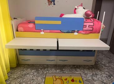 Vendo pratico letto a castello multifunzione. La struttura comprende: 1. Letto superiore con barriera di protezione. 2. Letto inferiore estraibile su ruote. 3. Due scrivanie estraibili indipendenti. 4. Cassettoni salvaspazio alla base. Ritiro a busca disponibile da subito No materassi