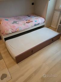 vendo letto scorrevole 200cm x 99cnm comprensivo di rete ortopedica e materasso con annesso cassettone contenente letto estraibile comprensivi di doghe ortopedica e materasso . struttura colore rovere sbiancato, bordo rosa e cassettone colore prugna. arredo mondo cameretta. 250€ tutto