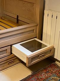 Il letto dispone di ulteriori 4 casetti, con un che ha un coperchio cosi da poterlo usare come comodino. Ed un posto per un altro materasso sotto ai casetti.