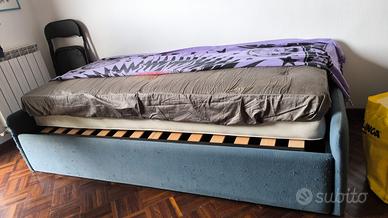 Letto singolo 90x200 canguro, con doghe, imbottito e foderato in blu, completo di materassi in lattice memory