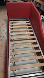 letto in finta pelle rossa con rete a doghe e spazioso cassettone. Misure d'ingombro: 210x90, materasso 190x80.