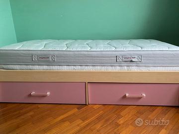 Vendo letto in legno dimensioni standard, adatto camera bambina. con cassettoni. Vendo solo con ritiro a casa mia in zona via angelo rizzoli a milano. Vendo anche materasso permaflex di ottima qualità (pagato più di 500 euro due anni fa per mia figlia piccola), il tutto a 250 euro (50 euro il letto più 200 il materasso).