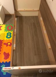 Struttura letto singolo per bambino/a. Testiera artigianale a forma di casetta con illuminazione a led incorporata. Testiera: fondale bianco e "tetto" color legno, pediera bianca. Può contenere rete da 190x80cm. Misure testiera: 143 cm altezza al centro (colmo), 117 cm ai lati. Larghezza esterna e della struttura testiera: 88 cm. Rete e materasso non inclusi Ritiro a mano e montaggio a carico dell'acquirente.