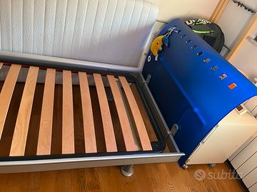 Letto singolo marca Bontempi Casa con struttura e giroletto in alluminio e testiera in metacrilato blu comprensivo di rete ortopedica a doghe Bontempi cm. 90x190 e materasso Bontempi modello Fleur in Hydraform (tipo Memory Form) cm. 90x190