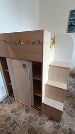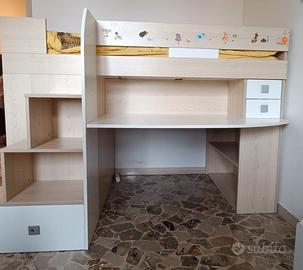 Dispone di un letto a mezza altezza (90x190cm) con scrivania integrata (70x130cm) e armadio contenitore a porte scorrevoli con 2 ripiani interni.