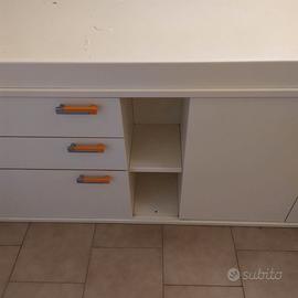 Struttura letto singolo 90 x 200 cm. Il letto è a circa 70 cm da terra. Sotto ci sono 3 cassetti (90 cm di lunghezza), un piccolo spazio aperto per le scarpe/ciabatte ed infine un ampio ripostiglio (90 x 90 cm). Ideale per ragazzi con una piccola stanza.