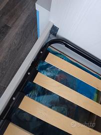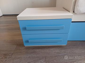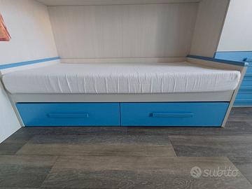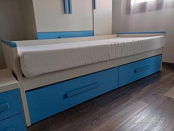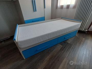 Vendo letto singolo con ampi cassettoni contenitore e rete a doghe, completo di comodino coordinato, in ottime condizioni. Misure letto: 199 x 91 cm (altezza 60 cm) Misure comodino: 50 x 42 x 39 cm Letto molto pratico e capiente, ideale per cameretta. I cassetti scorrono bene e offrono spazio per biancheria, giochi o vestiti. ✔ Rete a doghe inclusa ✔ Possibilità di avere anche il materasso ✔ Trasporto a carico dell’acquirente Prezzi: 160 € senza materasso 200 € con materasso