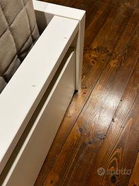 Letto singolo con testiera alta per materasso 90x200. Due cassetti contenitori con ruote. Doghe comprese. In ottimo stato, solo qualche piccolo graffio come in foto.