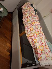 Vendo letto singolo con cassettone sotto il letto molto capiente. Nella foto avevo tolto la fodera della spalliera e fascia laterale per pulirla ma è in ottime condizioni e di colore carta da zucchero. vendo per cambio arredo stanza