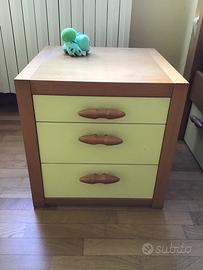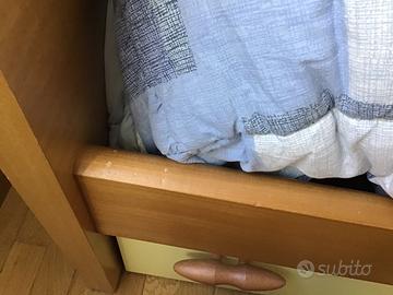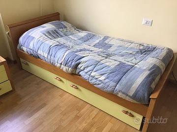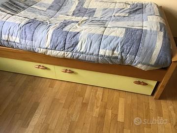 Vendo letto singolo con comodino. Struttura letto in legno finitura ciliegio; Cassettoni sotto letto con ruote, finitura frontali giallo tenue. Adatto a rete larghezza 80 cm., senza piedini (poggia su appositi sostegni). Rete e materasso NON compresi. Comodino coordinato. In ottimo stato, qualche segno di usura su un fianco (vd foto).