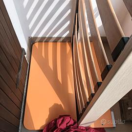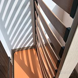 Letto singolo testate arancioni e doghe. Ne manca una.