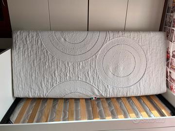 Il letto è di fabbricazione artigianale e il materiale usato è multistrato con formica, misure 190x90 cm, colore bianco. Le doghe sono in faggio, la rete del secondo letto ha una doga mancante. Il letto estraibile presenta due ruote per spostarlo velocemente e due piedi per rialzarlo da terra.