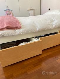 Letto singolo contenitore con tre comodi cassetti su ruote, completato da mobile coordinato con altri due cassetti. Colore bianco e betulla. Completato da materasso in schiuma altezza 18 cm. Marca Ikea