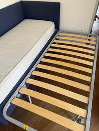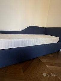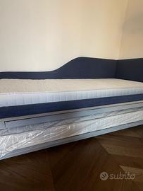 Letto singolo Marca Twils con tessuto blu navy e angolo testata. A scomparsa si trova secondo letto con rete e materasso. Usato pochissimo. Zona Rimini no spedizione