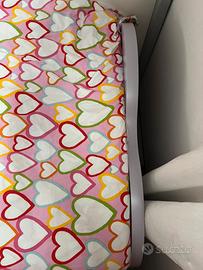 Letto singolo, colore lilla con testiera e pediera con letto estraibile, che può renderlo un matrimoniale. Un materasso, una rete, un copri materasso, un Topper, parure di copri piumino incluse.