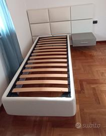 Letto singolo rivestimento in similpelle bianca/panna,compreso di doghe in legno,testiera legno con inserti rivestiti in similpelle bianca/panna, comodino. Eventualmente comprendo anche materasso in memory foam.