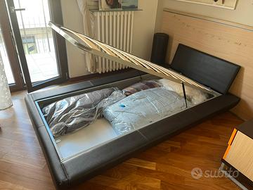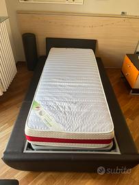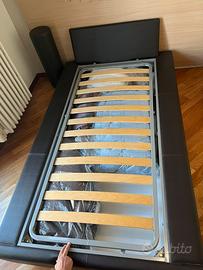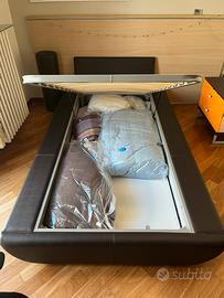 Letto (125x215) : singolo, rete con doghe in legno (80x190) , rivestimento in pelle marrone scuro, ampio contenitore,