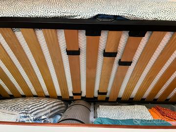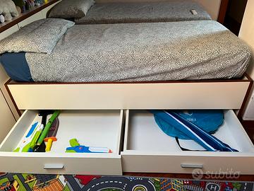 Vendo due letti singoli in legno (no Ikea), rete in legno con regolazione di rigidità delle doghe, sollevabile da un lato con primo scomparto contenitore. Sotto al primo scomparto che misura interamente la dimensione del letto, ci sono due cassettoni.