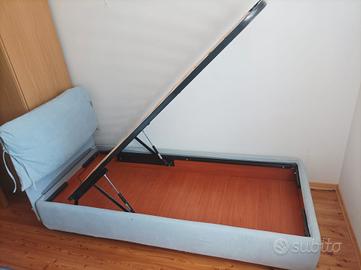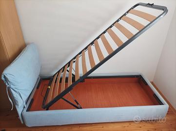 Letto singolo contenitore con testiera imbottita e rimovibile. Rete con doghe in legno. Completamente sfoderabile e lavabile in lavatrice. Colore azzurro chiaro. Lunghezza 208 cm x 90 cm. Altezza testiera 100 cm. Rete per materasso singolo 190 x 90 cm.