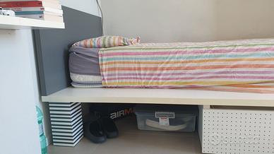 Letto singolo 1m x 2m Dielle Doimo per ragazzi, attuale materasso singolo standard lascia una cornice libera, ampio cassettone con fodera antipolvere, piede a righe bianco e grigio.
