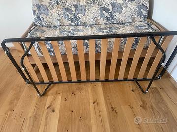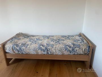 Vendo letto singolo con rete sottostante estraibile (con doghe). Il letto singolo può essere utilizzato anche come divano (come si vede in foto) grazie al grande cuscino removibile. Estraendo la rete sottostante può diventare un letto matrimoniale a tutti gli effetti. Vendo la struttura, il cuscino grande per il divano e se richiesti anche i due materassi. Il materasso per la parte estraibile è in gommapiuma altezza 10 cm (altrimenti non si può inserire nella parte sottostante estraibile); il materasso del letto singolo è con le molle e altezza 19 cm. Se interessati anche ai materassi posso mandare foto aggiuntive.