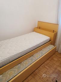 Letto singolo in legno con secondo letto a scomparsa(il letto sotto ha la possibilità di essere alzato al livello del altro con un semplice movimento) più vano contenitore.