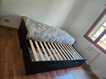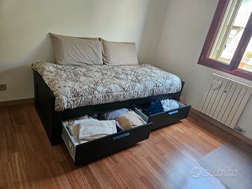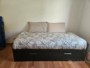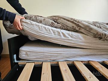 Vendo letto singolo 80x200 e matrimoniale, acquistato 1 anno fa all'ikea, vendo per cambio arredamento. Il letto ha 3 funzionalità, da come si evince nelle foto, si può utilizzare come: divano, letto singolo o letto matrimoniale. Grande vantaggio della struttura sono i due ampi cassettoni contenitori. Incluso nel prezzo, ci sono i due comodi materassi su misura. Quando la struttura è utilizzata come letto singolo i due materassi sono uno sopra l'altro (come in foto), quando invece viene utilizzata da letto matrimoniale, i due materassi si mettono uno a fianco all'altro. Chi compra si fa carico anche dello smontaggio, facendo particolare attenzione al parquet. Nb: nuovo all'ikea costa 369, escluso di materassi. I materassi acquistati sono pari a 70 euro l'uno. Il letto è stato usato pochissime volte e non riporta alcun segno di usura. zona Mestre chirignago