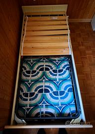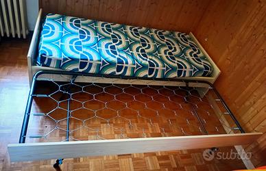 Letto singolo in legno chiaro, switchabile a matrimoniale estraendo il secondo letto dalla parte inferiore come si vede in foto, Con un meccanismo a molla il letto una volta estratto dall'alloggiamento si alza automaticamente a livello del letto già presente. Comodo e funzionale,si prepara in pochi secondi e si riposiziona in altrettanti pochi istanti.