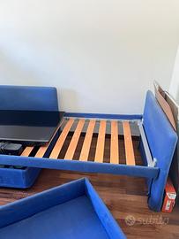 Letto singolo Flou: una piazza, 2 cassettoni (come in foto) che riprendono lo stesso tessuto del letto; colore blu elettrico. Letto in ottime condizioni. Se interessati per 80€ vendo anche materasso