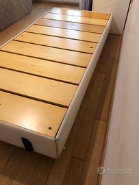 Letto singolo Flou, con doghe in legno ripiegabili a libretto per facile smontaggio e pulizia. Struttura imbottita, con rivestimento in tessuto cotone color lilla, facilmente sfoderabile e lavabile in lavatrice. No spedizione. Ritiro in loco. Incluso Materasso ortopedico