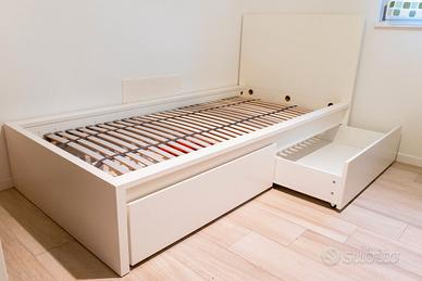 Letto singolo bianco opaco con cassettoni (a ruote), doghe in legno e materasso. Misure: Larghezza 105,5 cm - Lunghezza 210 cm. Altezza testiera 100 cm. Materasso: 90x200 cm