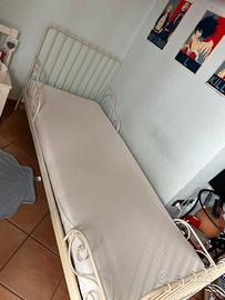 Il letto è un modello IKEA, buone condizoni, in ferro battuto, di colore bianco. Ha 15 anni e presenta un solo difetto visibile (la rottura della barra verticale, mostrato in foto).