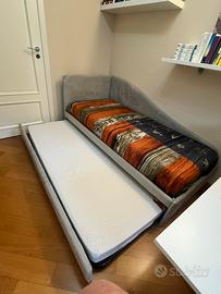 Vendo letto singolo con secondo letto a scomparsa appena rifoderato in alcantara grigio. È compreso il doppio materasso di cui uno in memory lattice al 100%. Il letto, essendo di produzione artigianale, è smontabile e facilmente trasportabile. Vendo perché ho acquistato un letto più grande.