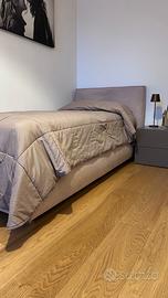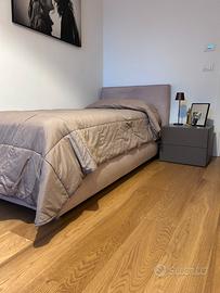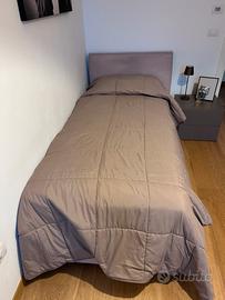 Letto singolo con struttura imbottita in tessuto color tortora, completo di rete. Design elegante e lineare, perfetto per camera da letto o stanza ospiti. In ottime condizioni, usato pochissimo. Con cassone.