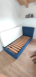 letto singolo imbottito, di colore blu, rete con doghe in legno in ottime condizioni, materasso incluso. misure letto 190 x 80; altezza testiera da terra 1 mt.
