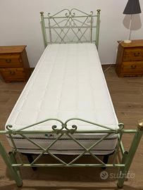 letto singolo in ferro battuto verde con inserti color oro, con materasso ortopedico completo di rete