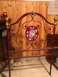 Letto singolo in ferro verniciato e ottone, cm 85x195, spazio per materasso 90x200, inserto dipinto a mano nella testara h 135,pediera h 85.