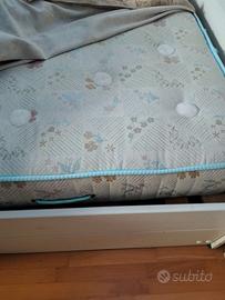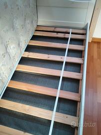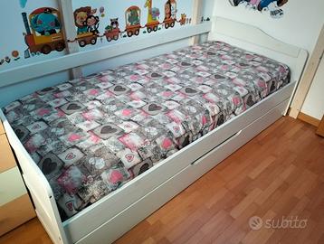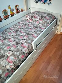 Vendo letto singolo in legno bianco con doghe in legno e con secondo letto estraibile. Il letto è in ottime condizioni, usato pochissimo. Misure struttura: Lunghezza: 203cm Larghezza: 96cm Altezza: 60cm 2 materassi inclusi misura 90x200 Spondina removibile Ikea in legno bianco Possibilità di ritiro letto montato con materassi al piano terra