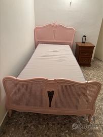 Letto singolo in legno verniciato rosa, munito di materasso mai usato. Ideale per la camera di una ragazza. Misure materasso: 90 x 200