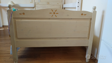 Letto da una piazza in legno naturale, verniciato con una mano di vernice atossica all'acqua. Doghe in legno. Shabby. Materasso memory compreso. Disponibile al trasporto a Pistoia e dintorni.