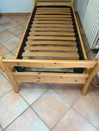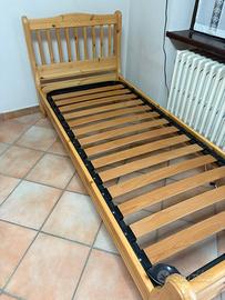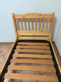 Letto singolo in legno massiccio, finitura naturale con testata intagliata, rete a doghe in metallo inclusa (216×86×H92 cm). Al momento usato con un materasso di 190×80 cm (materasso non incluso, eventualmente disponibile da valutare insieme). Struttura solida e curata nei dettagli, in ottime condizioni estetiche e funzionali.